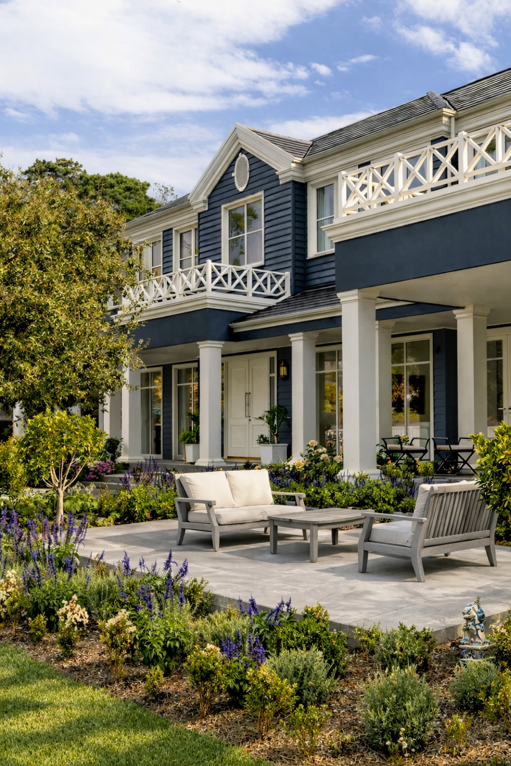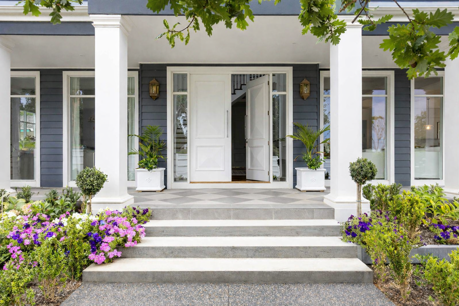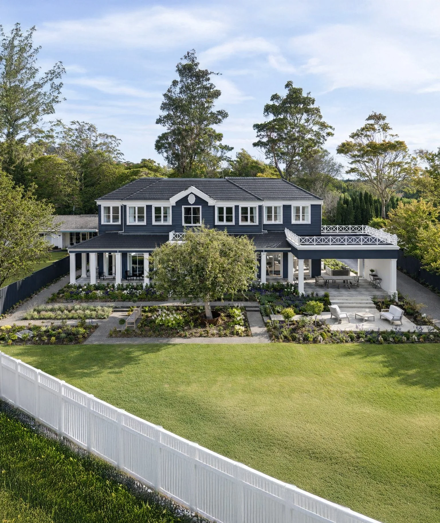 Set by Davies Bay, this residence blends the traditional elements of Hamptons architectural detailing and contemporary materiality. A navy facade, framed by white crisp detailing and a landscape palette taking inspiration from the clients love of travel.