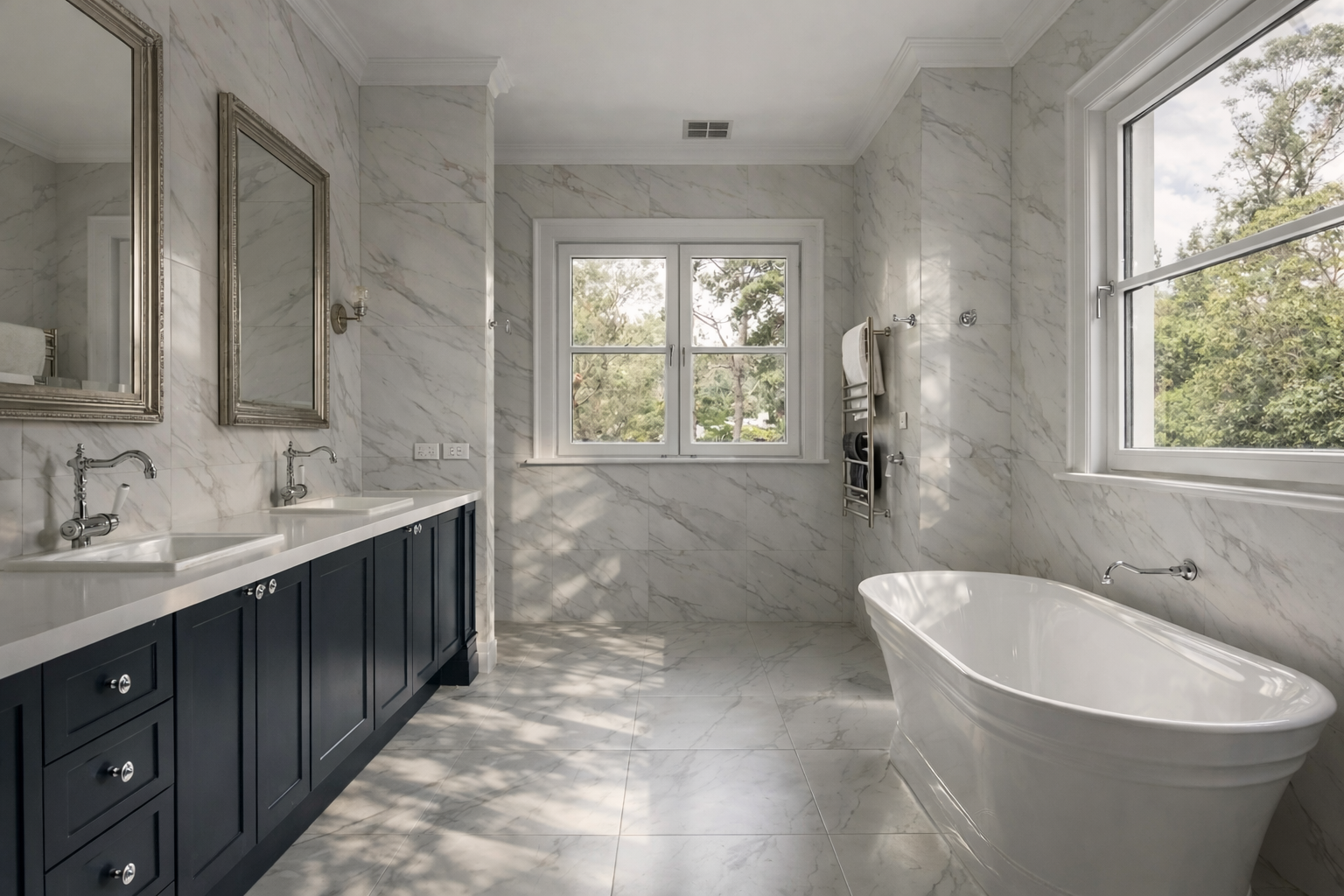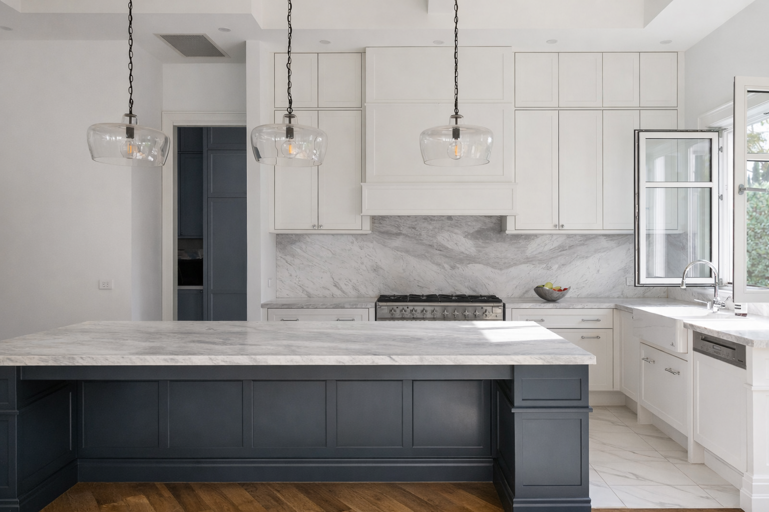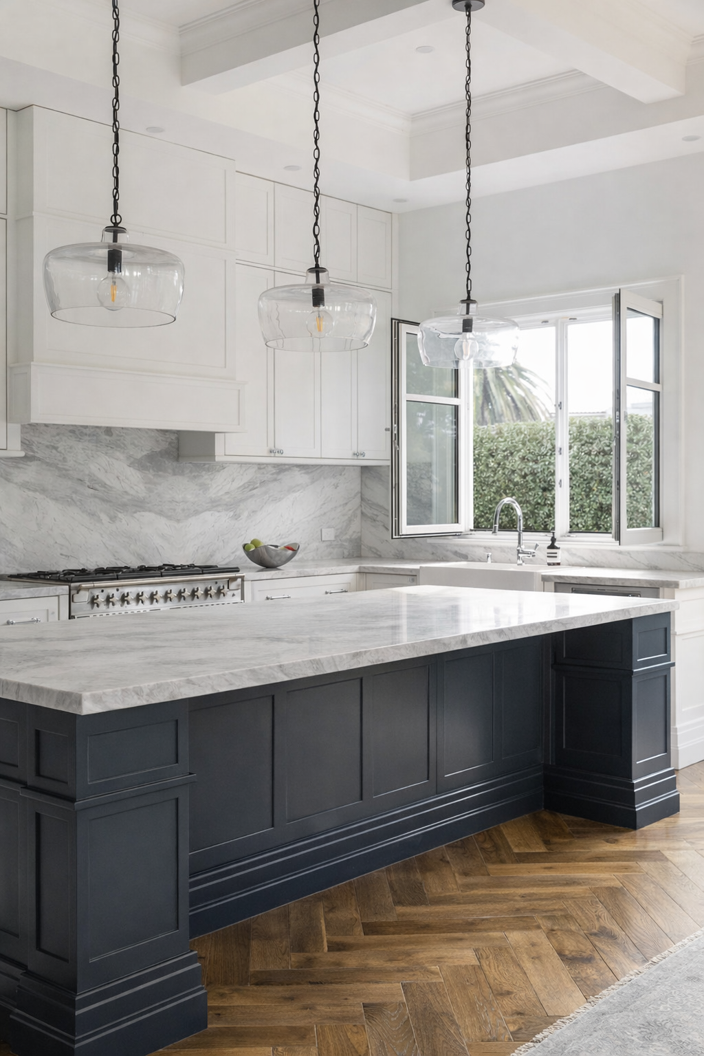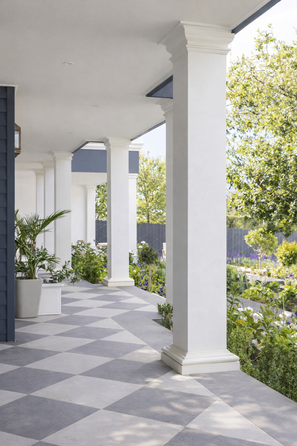 Set by Davies Bay, this residence blends the traditional elements of Hamptons architectural detailing and contemporary materiality. A navy facade, framed by white crisp detailing and a landscape palette taking inspiration from the clients love of travel.