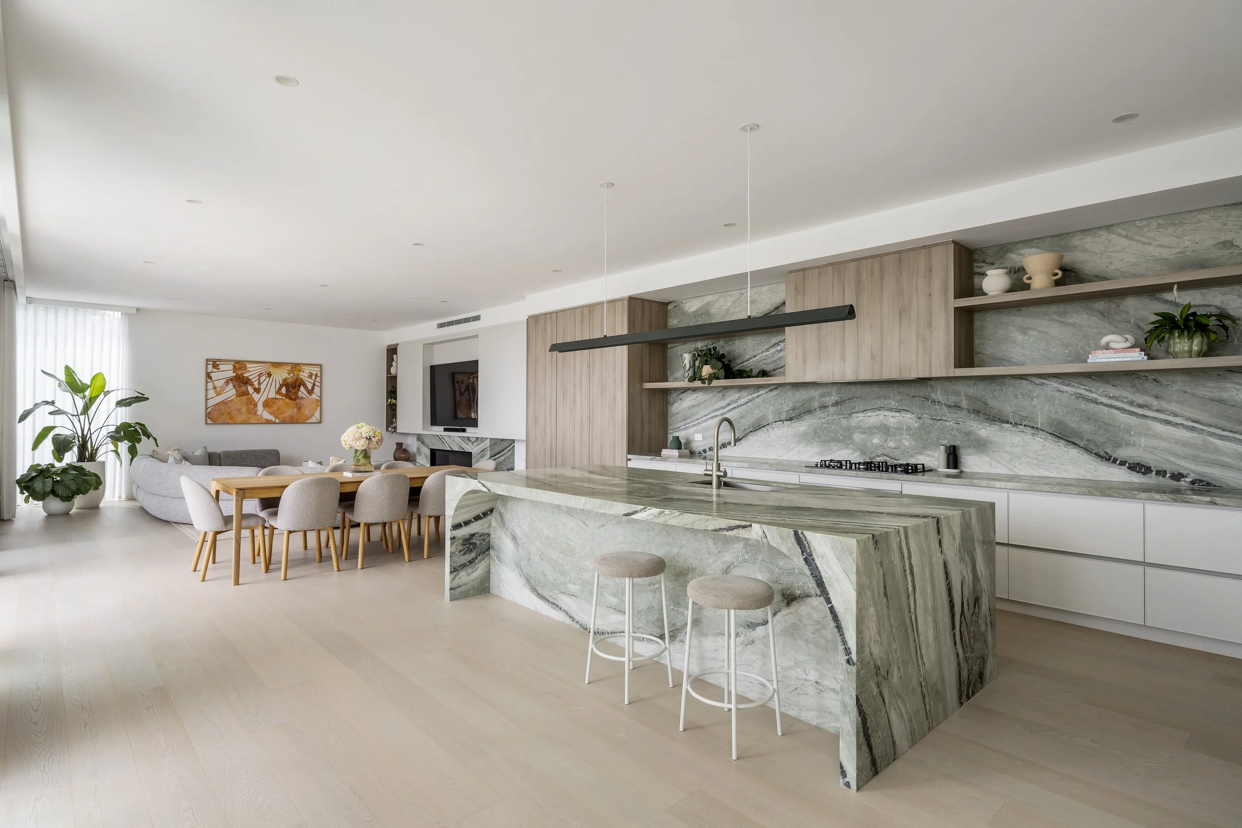Infused with light green olive tones, rich brown timbers and pops of green stones that captures the essence of the ocean's allure the interiors harmoniously blend earthy hues and organic textures to create an ambiance that is both serene and sophisticated.