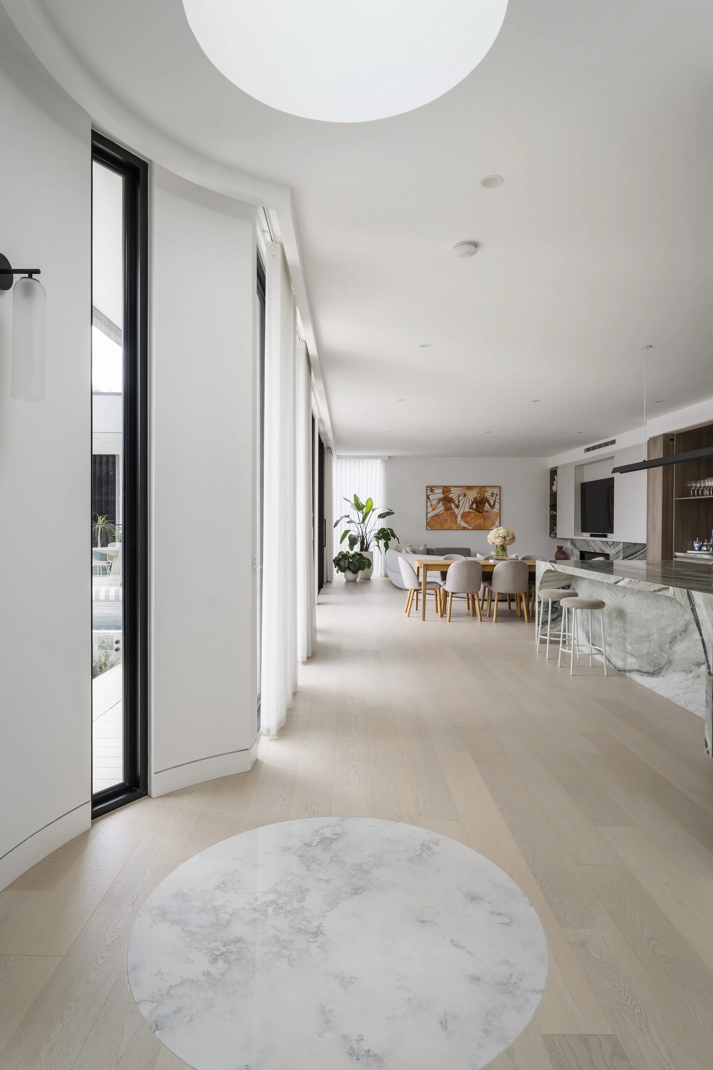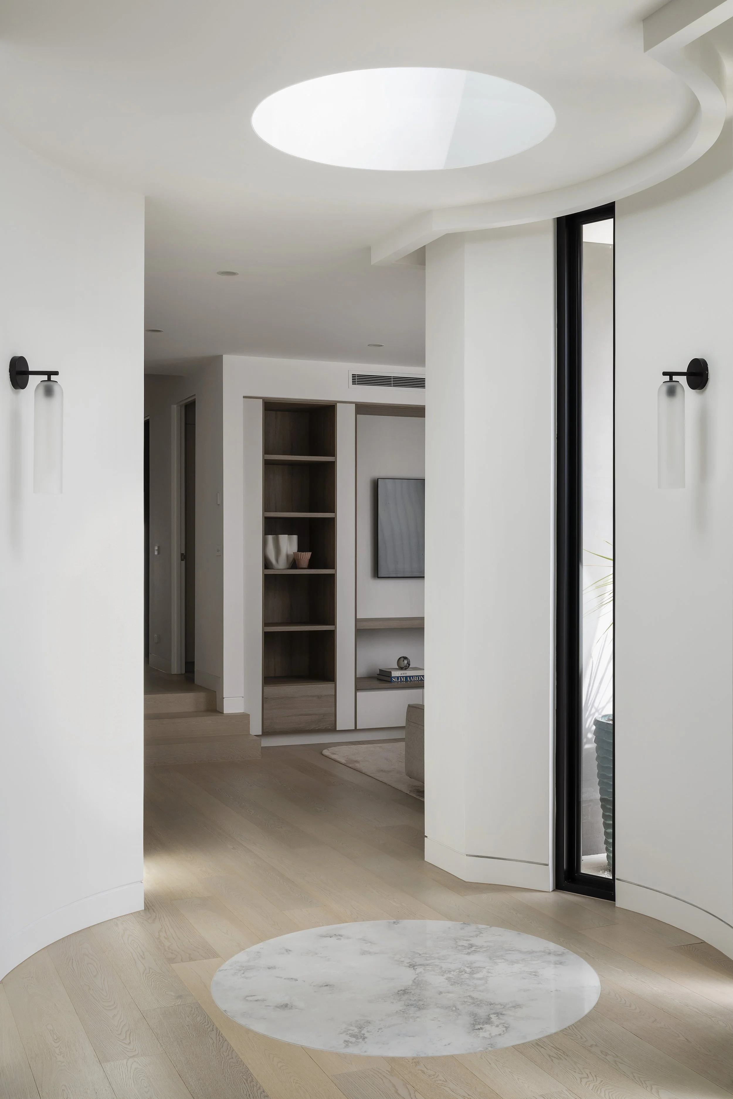 The marble inlay subtly echoes the geometry of the skylight above, creating a quiet dialogue between light, material, and form.