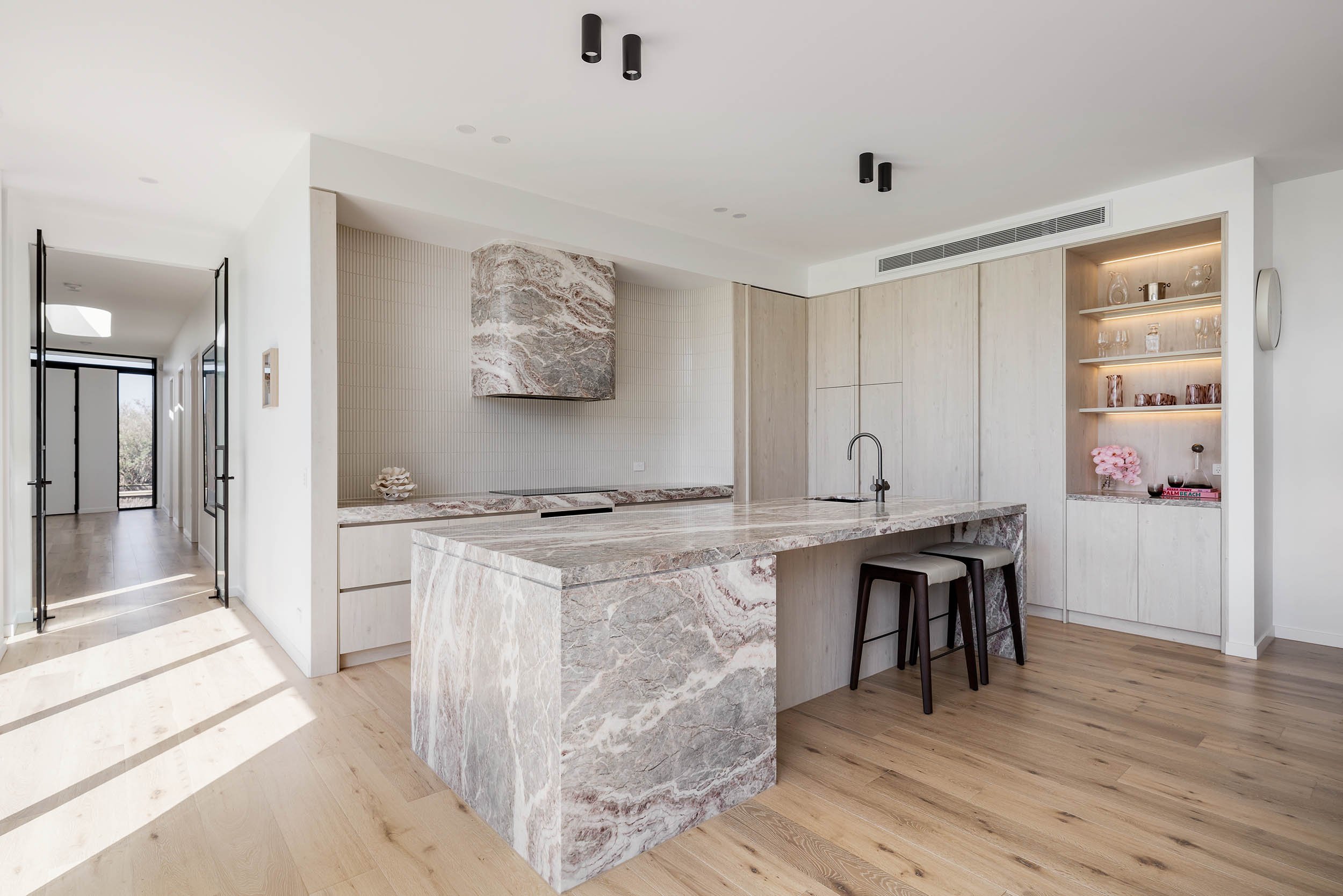 Al Mare’s statement kitchen featuring Fior di Pesco stone.