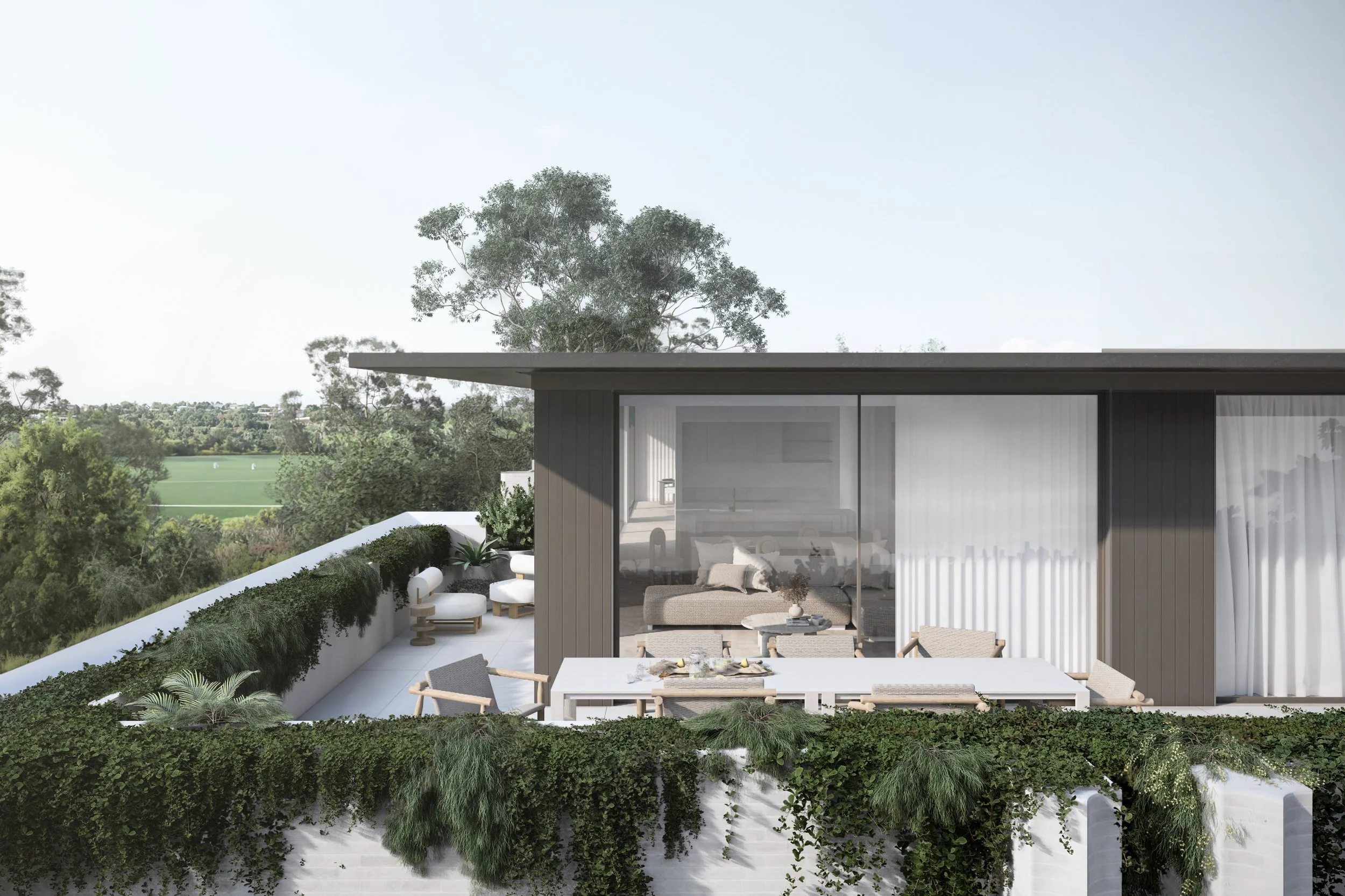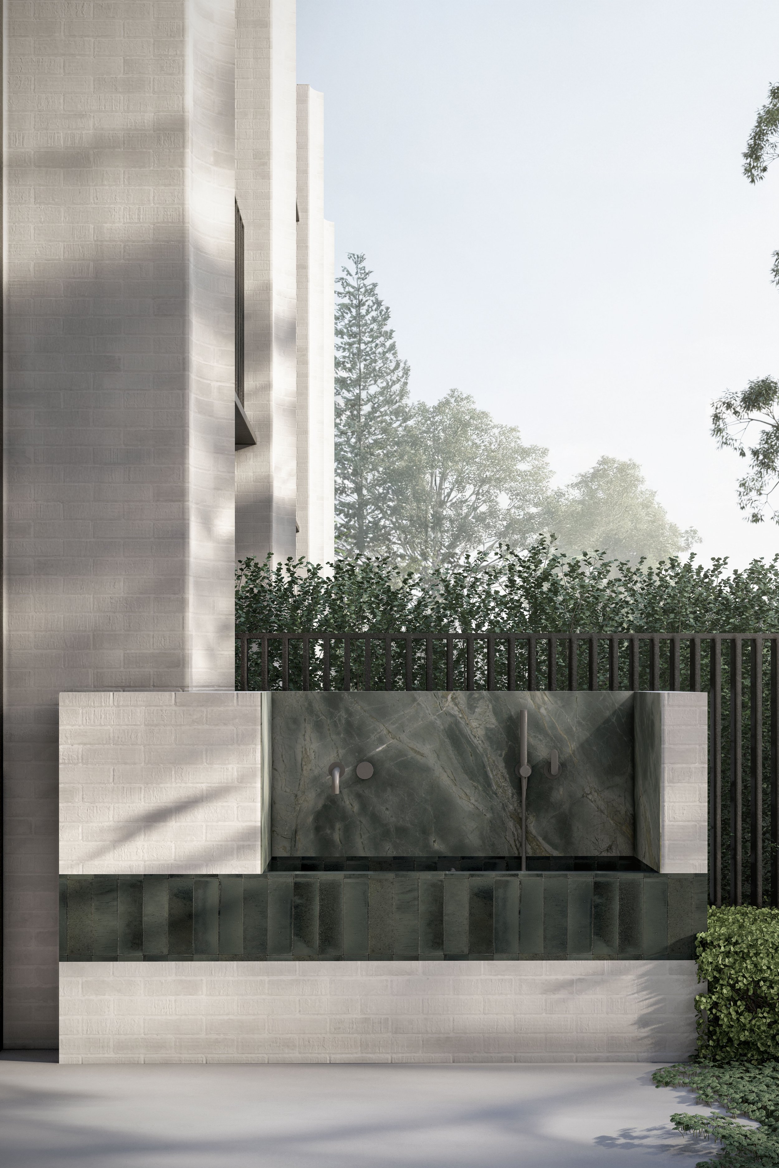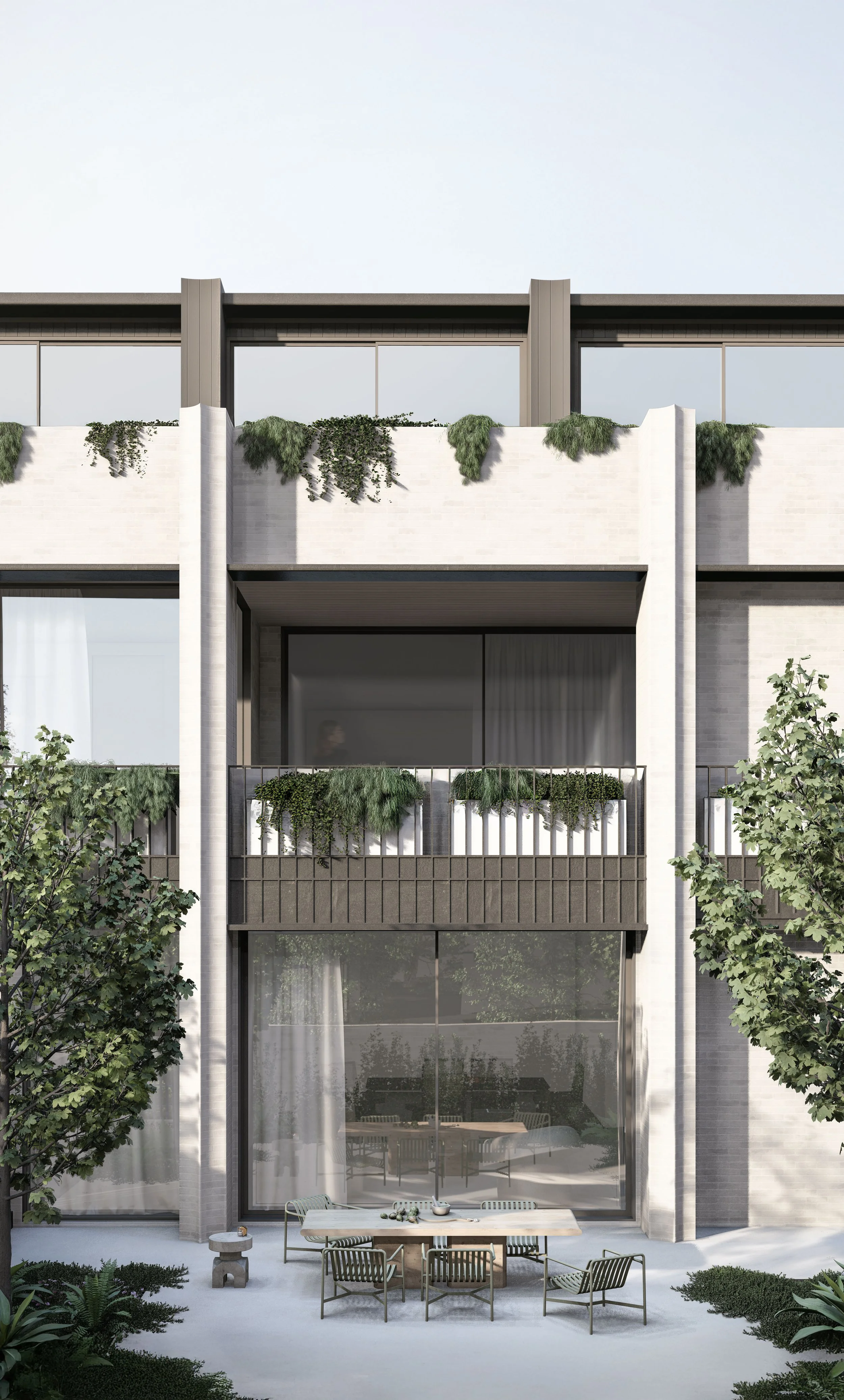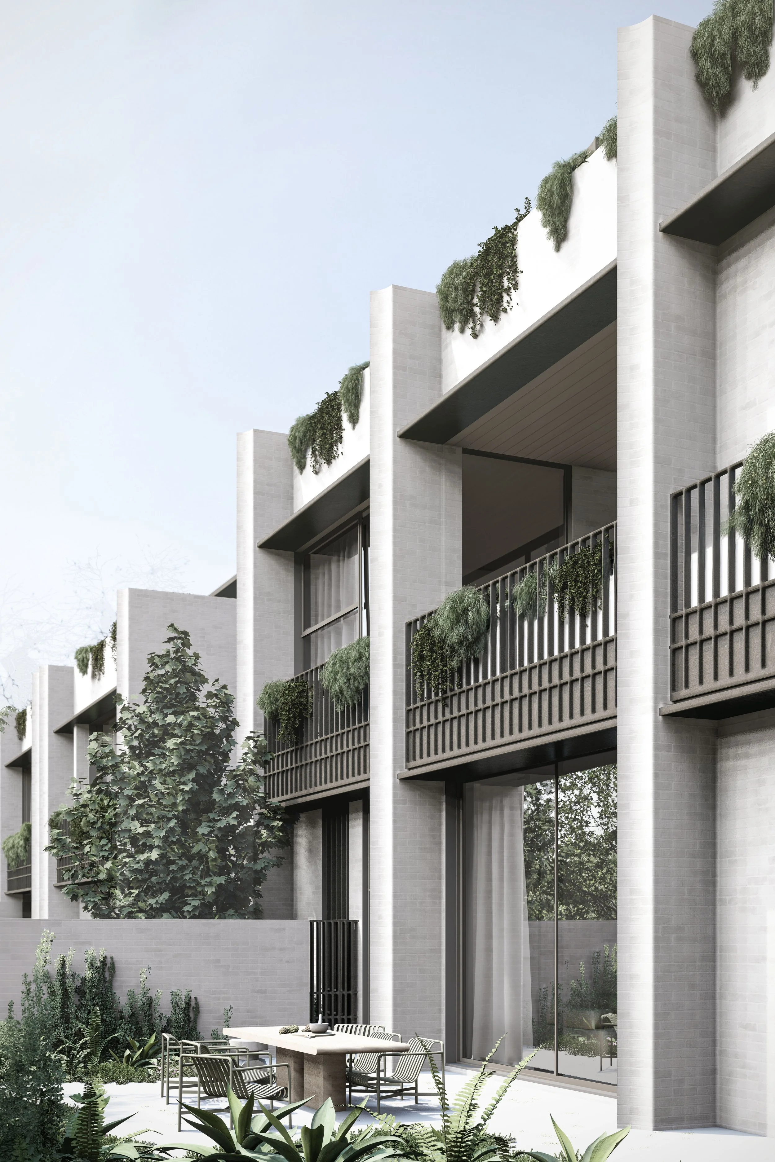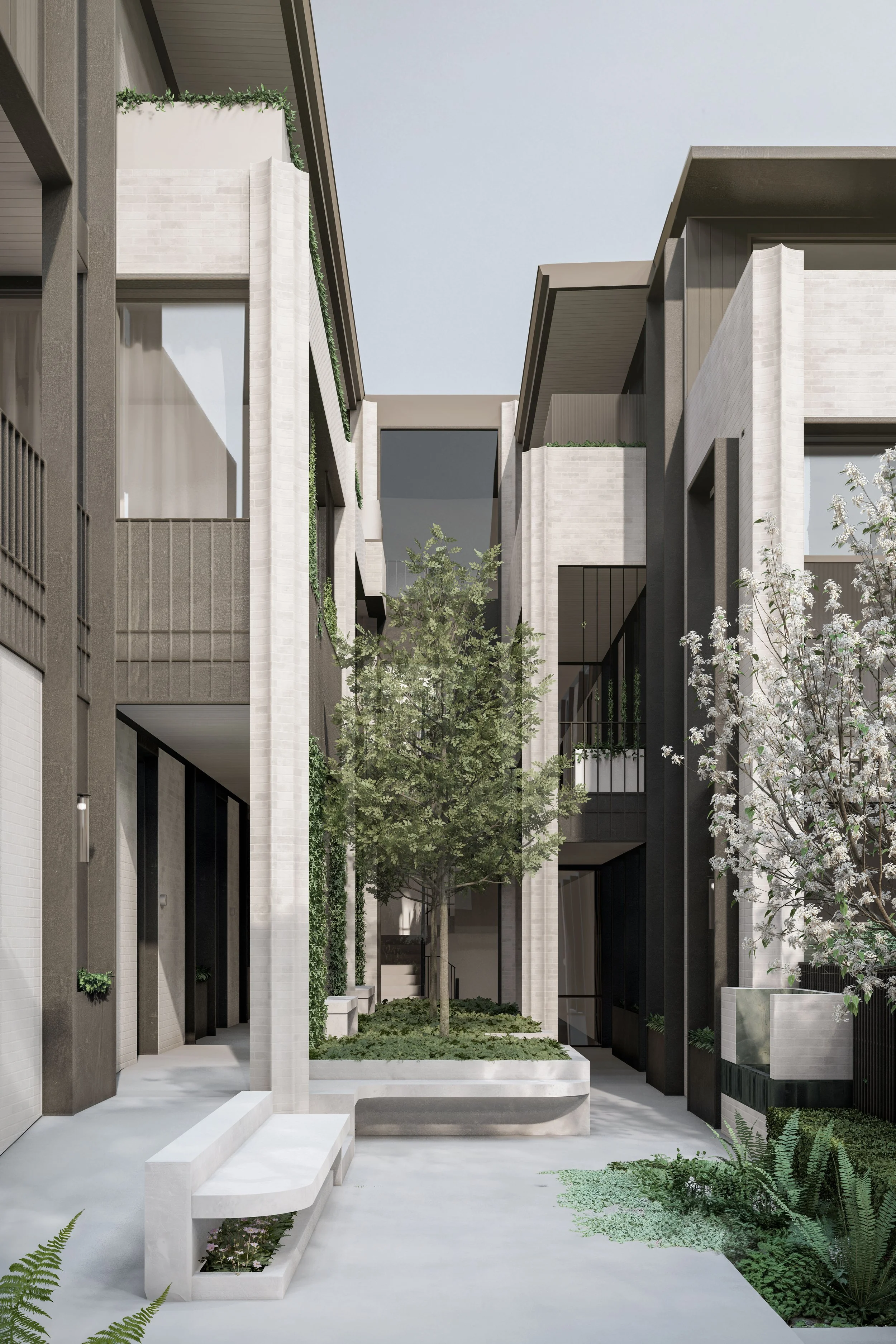 Central to its design is a beautiful green communal garden, fostering a sense of community and linking residents to the adjacent park. The sophisticated material palette of grey brick and bronze to create a timeless facade. The rhythmic layering of these materials is punctuated by extensive glazing, allowing light and nature to flow into the interiors. Lush greenery cascades down layered balconies, softening the building's verticality and creating a living facade.