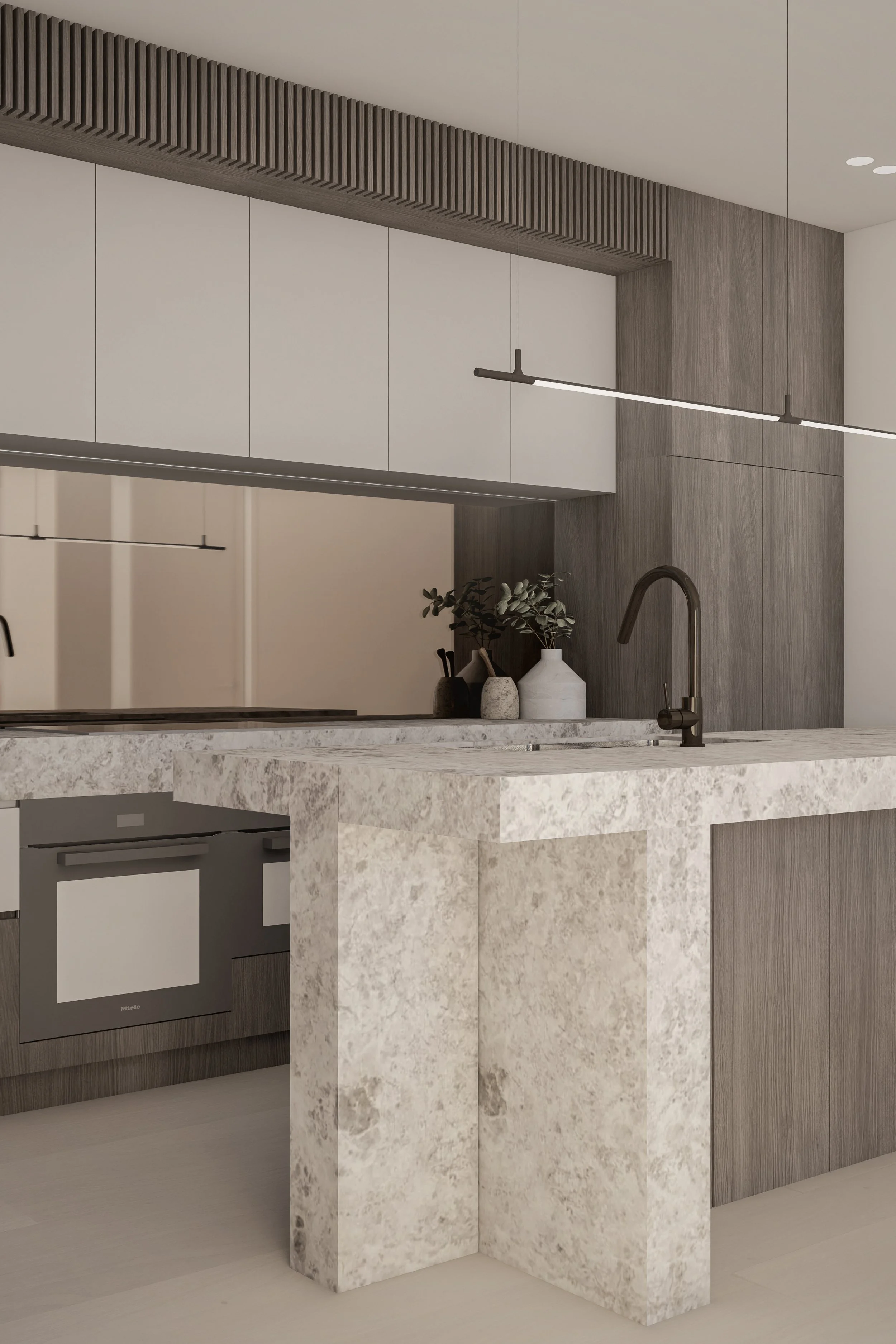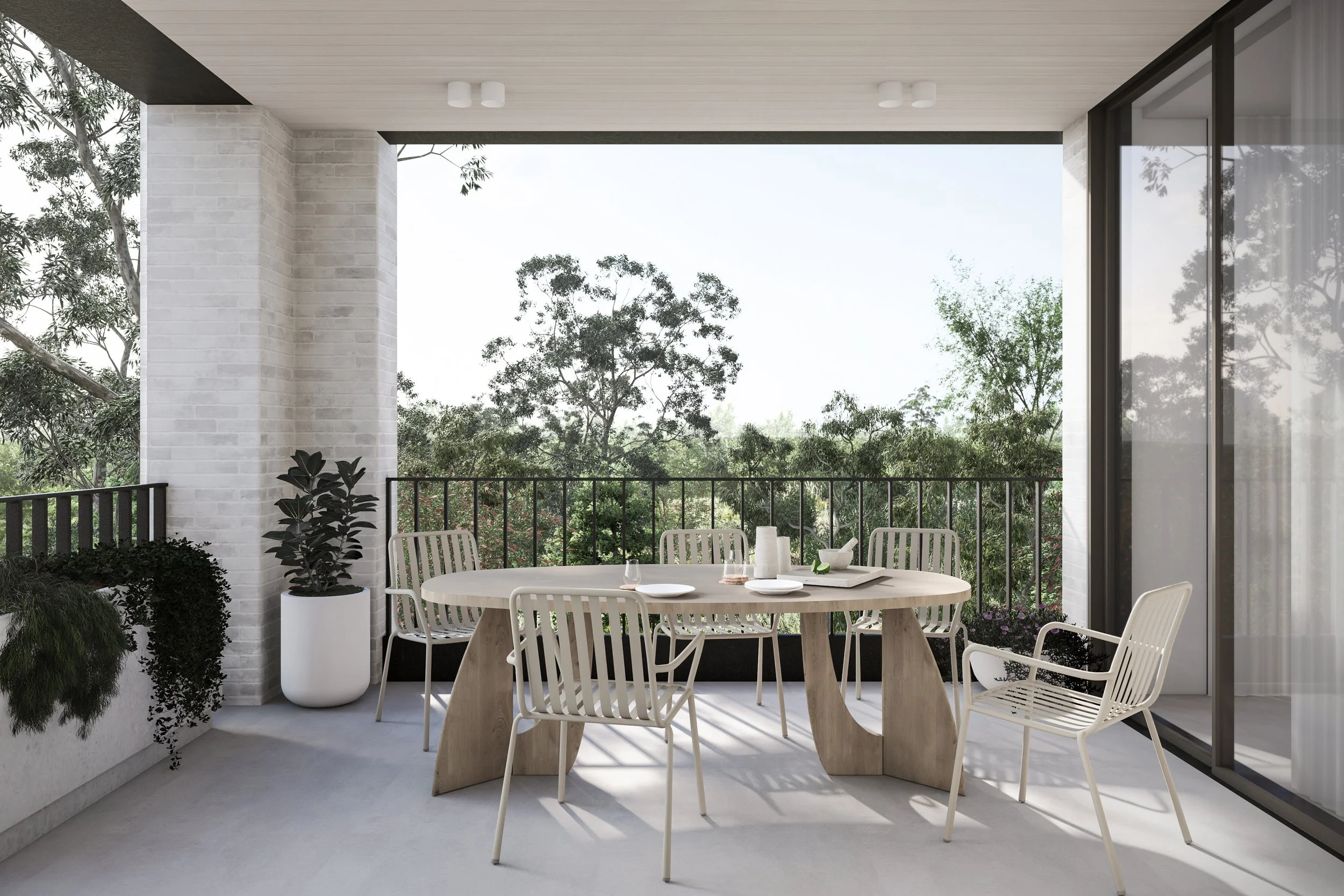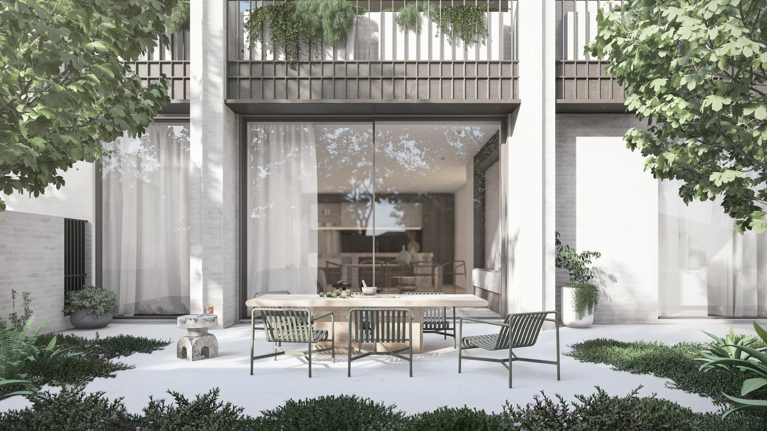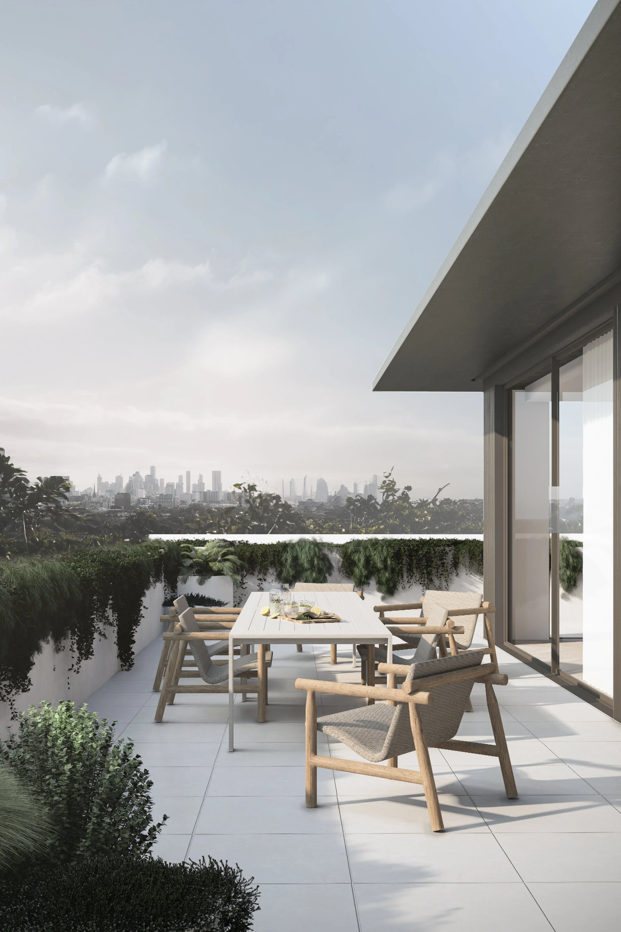 Central to its design is a beautiful green communal garden, fostering a sense of community and linking residents to the adjacent park. The sophisticated material palette of grey brick and bronze to create a timeless facade. The rhythmic layering of these materials is punctuated by extensive glazing, allowing light and nature to flow into the interiors. Lush greenery cascades down layered balconies, softening the building's verticality and creating a living facade.