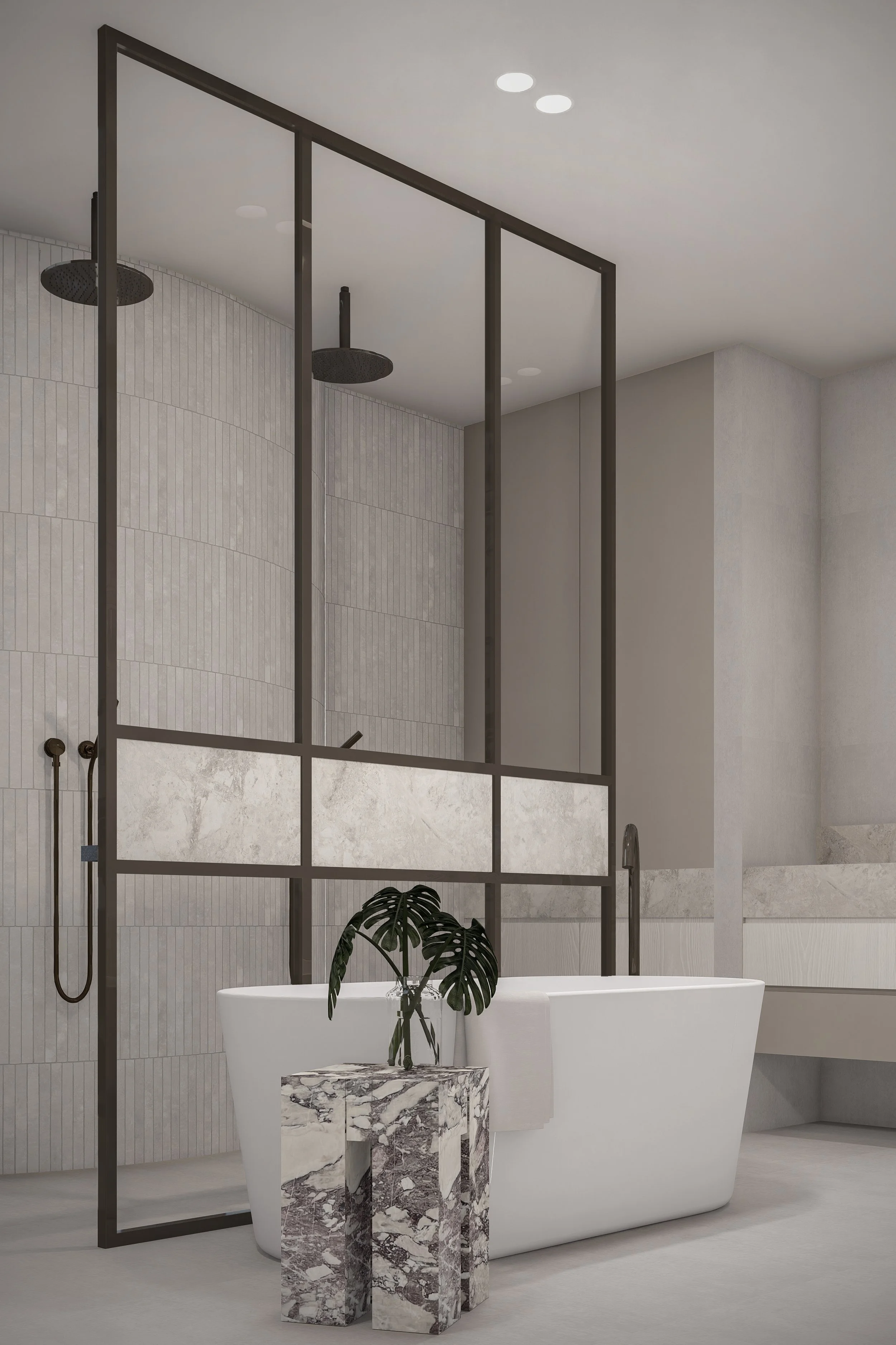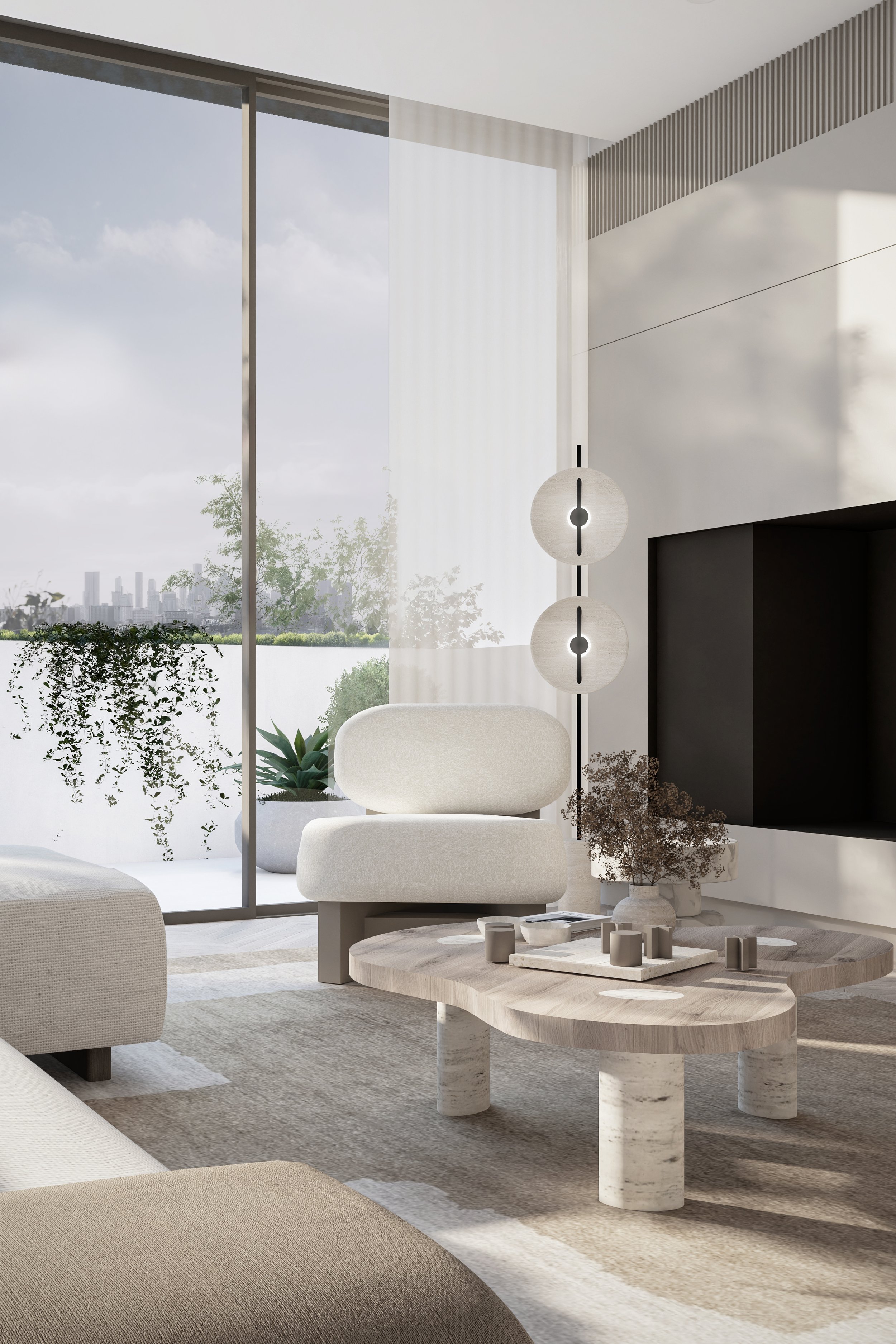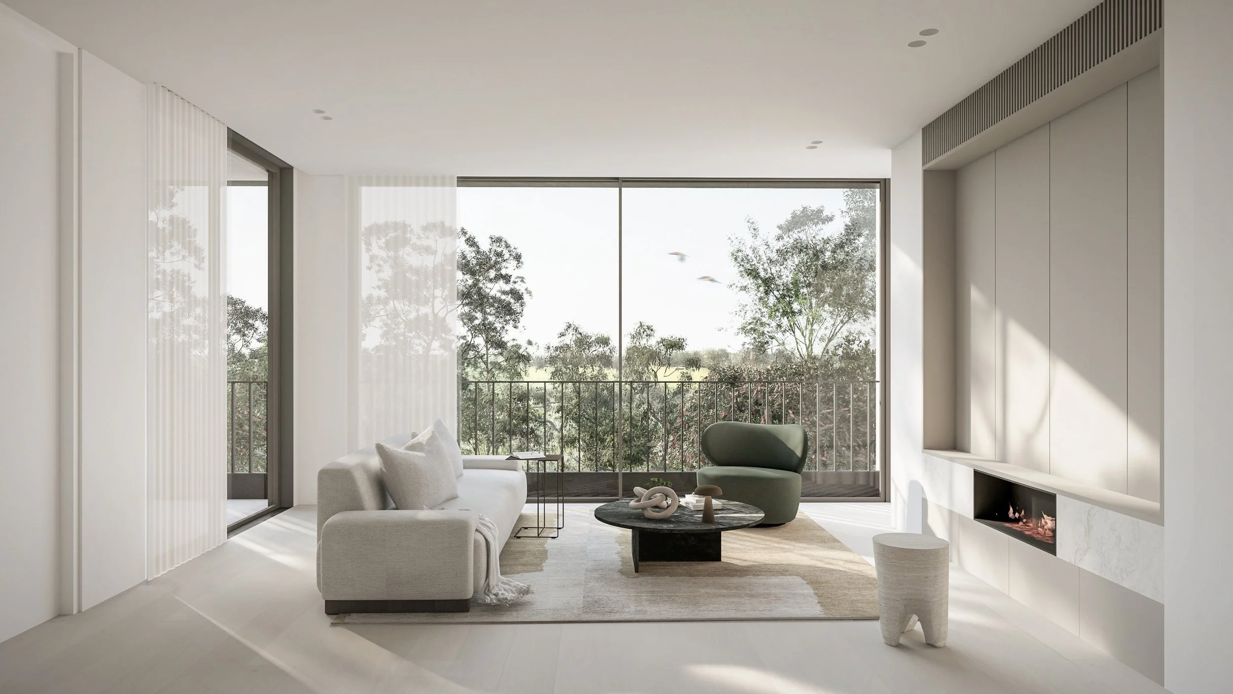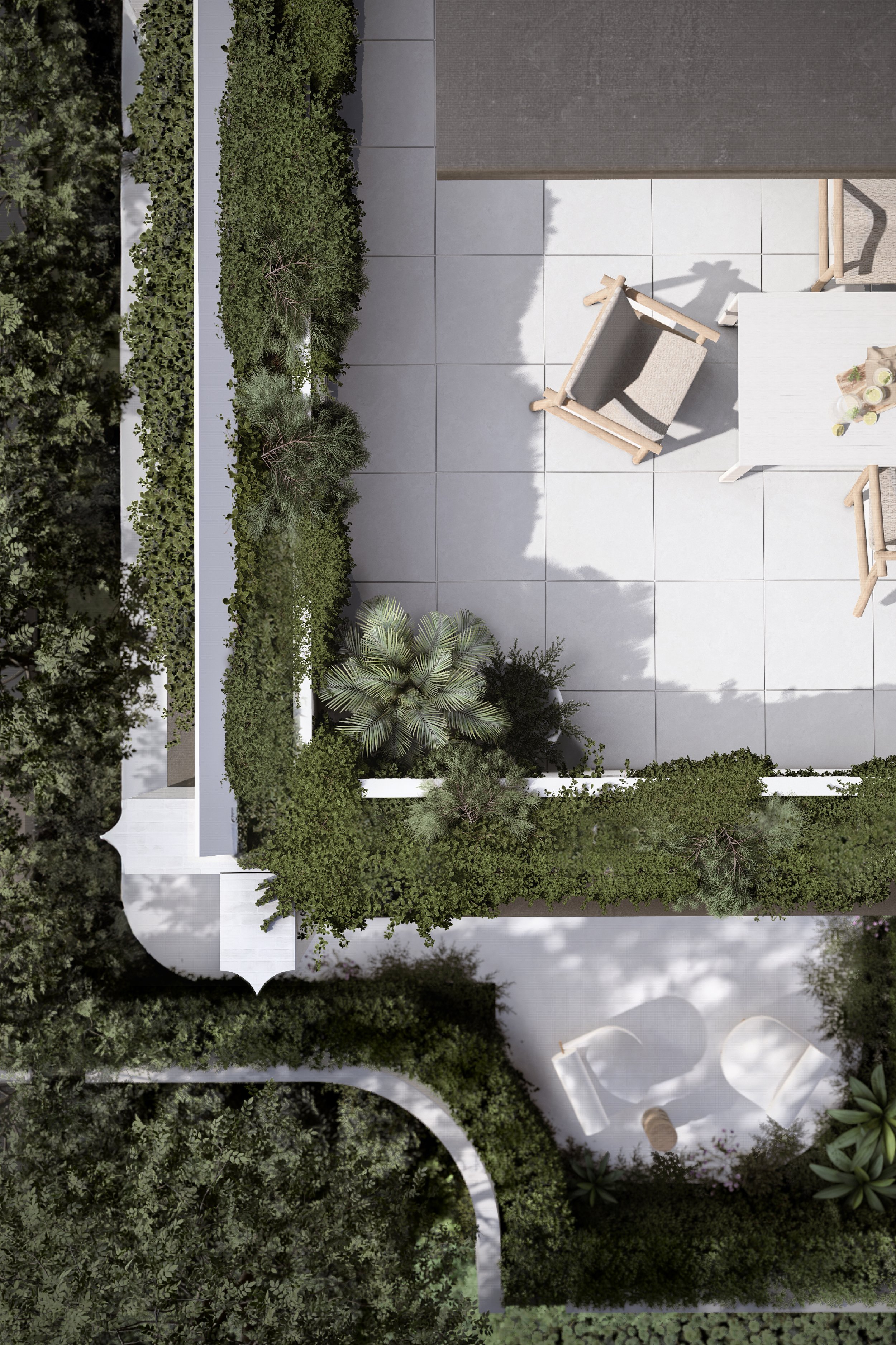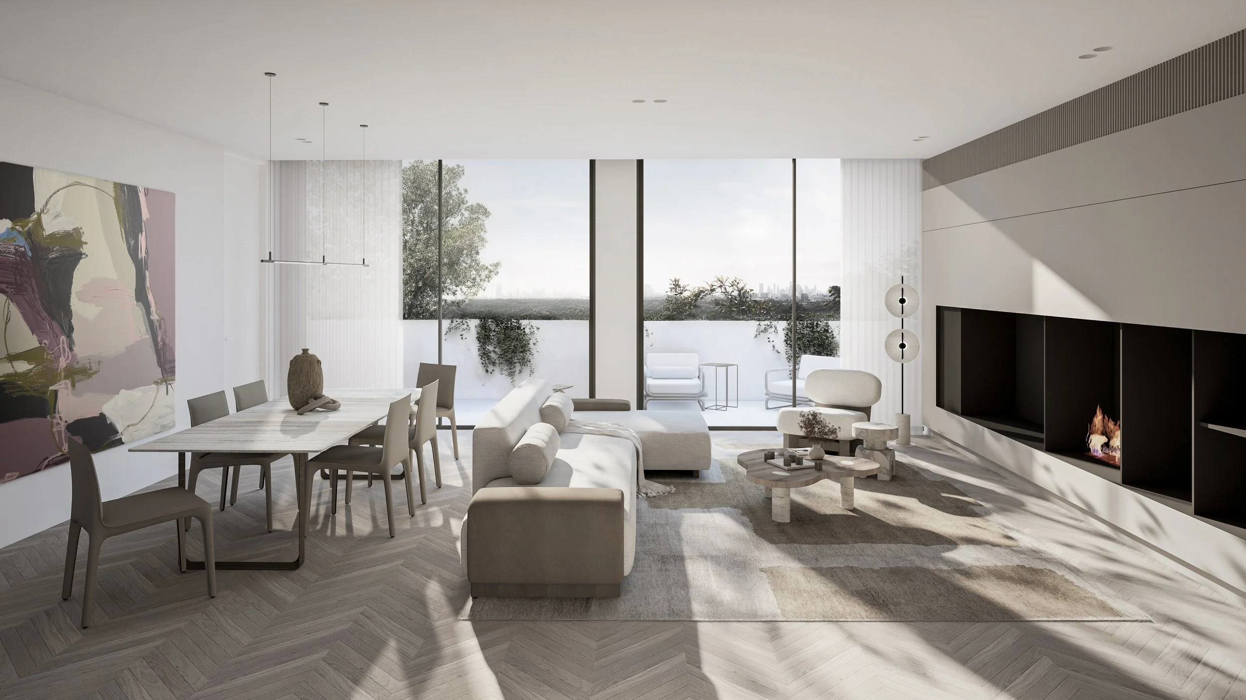 Central to its design is a beautiful green communal garden, fostering a sense of community and linking residents to the adjacent park. The sophisticated material palette of grey brick and bronze to create a timeless facade. The rhythmic layering of these materials is punctuated by extensive glazing, allowing light and nature to flow into the interiors. Lush greenery cascades down layered balconies, softening the building's verticality and creating a living facade.